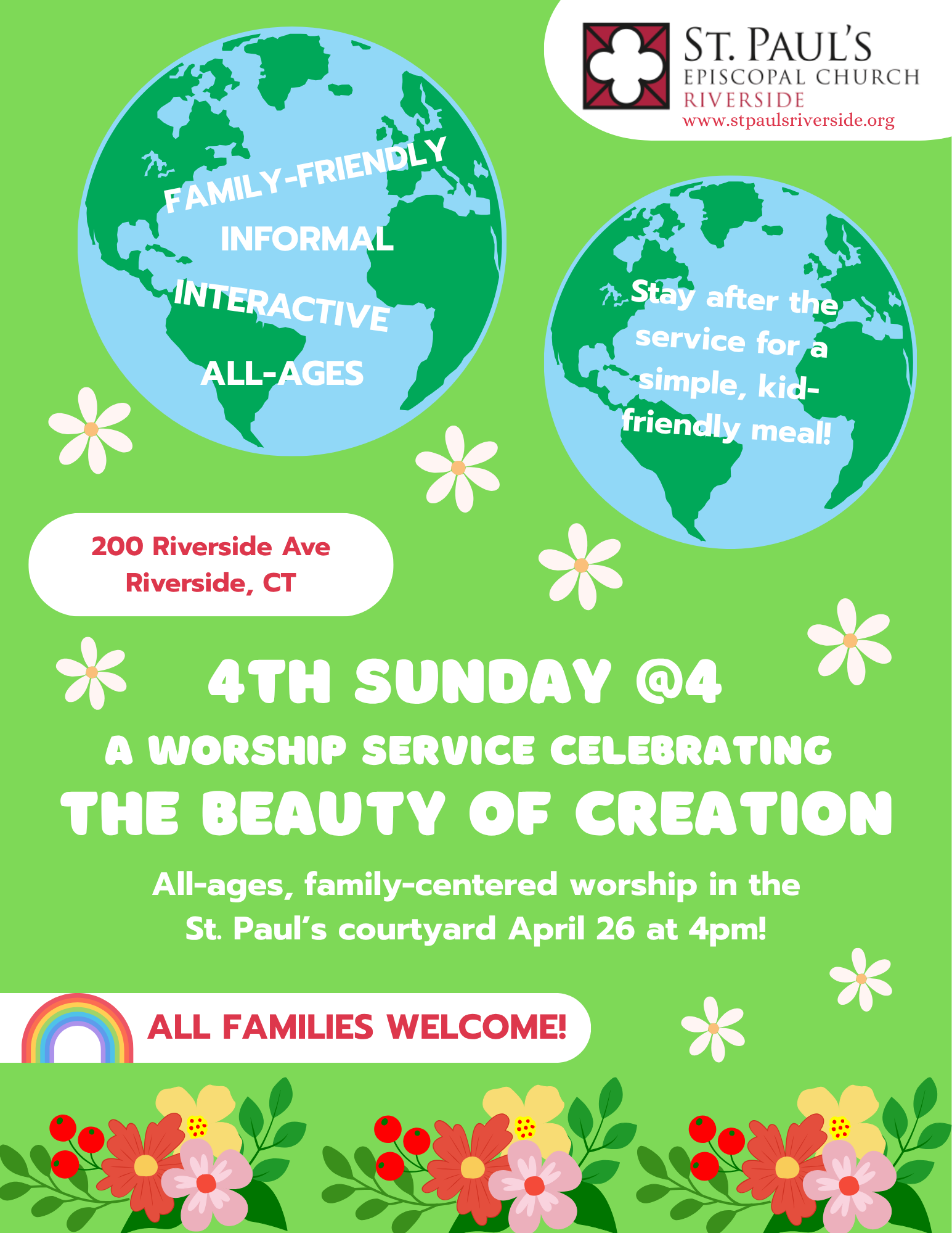 Join us for our family friendly service celebrating God’s creation on Sunday, April 26 at 4PM in the courtyard. Light supper will be served after the service.